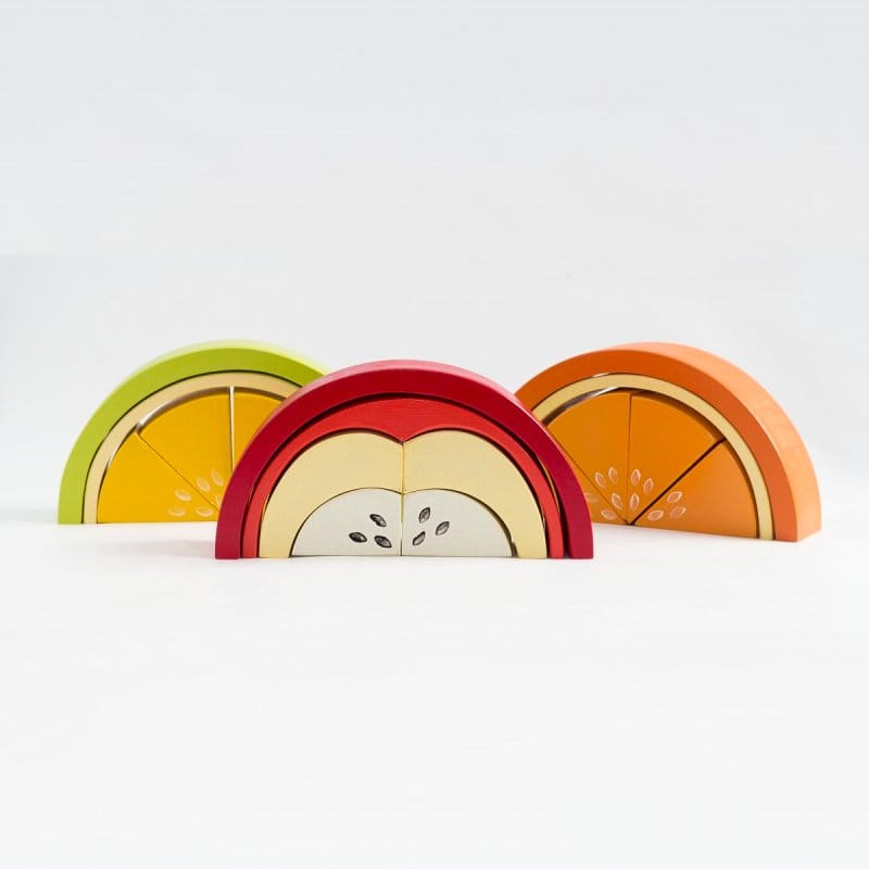 Bloques de construcción con características de frutas, estas ayudaran con la motricidad, distinción de colores, formas, tamañas, pesos.